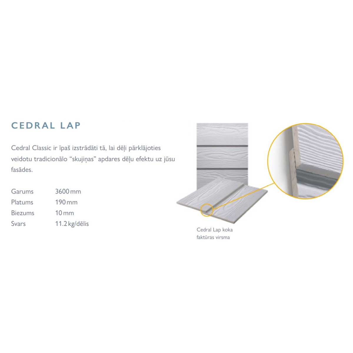 Šķiedrcementa fasādes apdares paneļi Cedral Lap ir viegli kopjami, tie nepūst un ir ideāla alternatīva tradicionālajiem koka fasādes apdares dēļiem. Viegli montējami, radīti, lai varētu ierīkot tradicionālajā veidā ar pārklājumu.