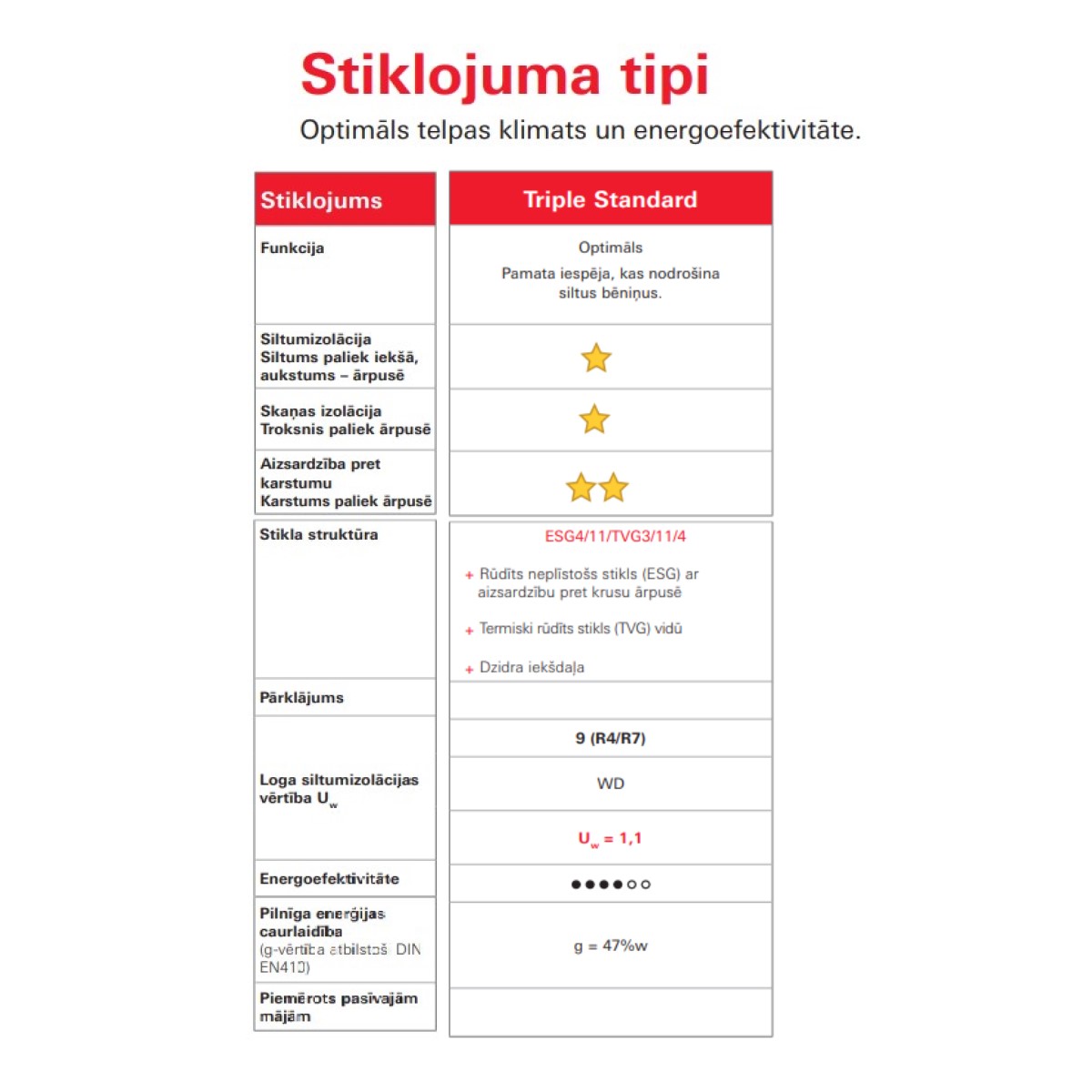 - Ug Siltumizolācija stiklam: 0,7 W/m2K