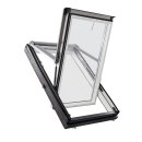 - Griešanās ass, kas izvietota loga trīs ceturtdaļu līmenī, nodrošina optimālu bēniņu vēdināšanu un apgaismojumu, kā arī nodrošina augstu lietošanas komfortu (loga vērtne „neienāk telpā”);