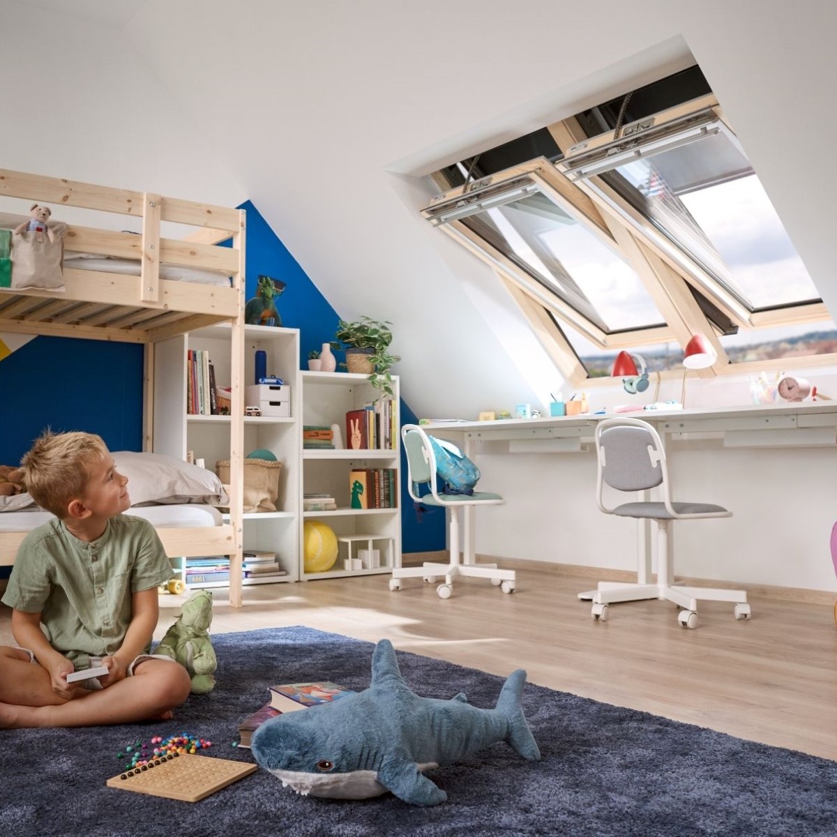 Velux Comfort Solārais jumta logs ar tālvadību, rokturis augšā eņģes pa vidu. Nevainojams komforts – tālvadības jumta logi paši aizveras, kad sāk līt, un tu vari tos atvērt no jebkuras vietas, kad vien vēlies.