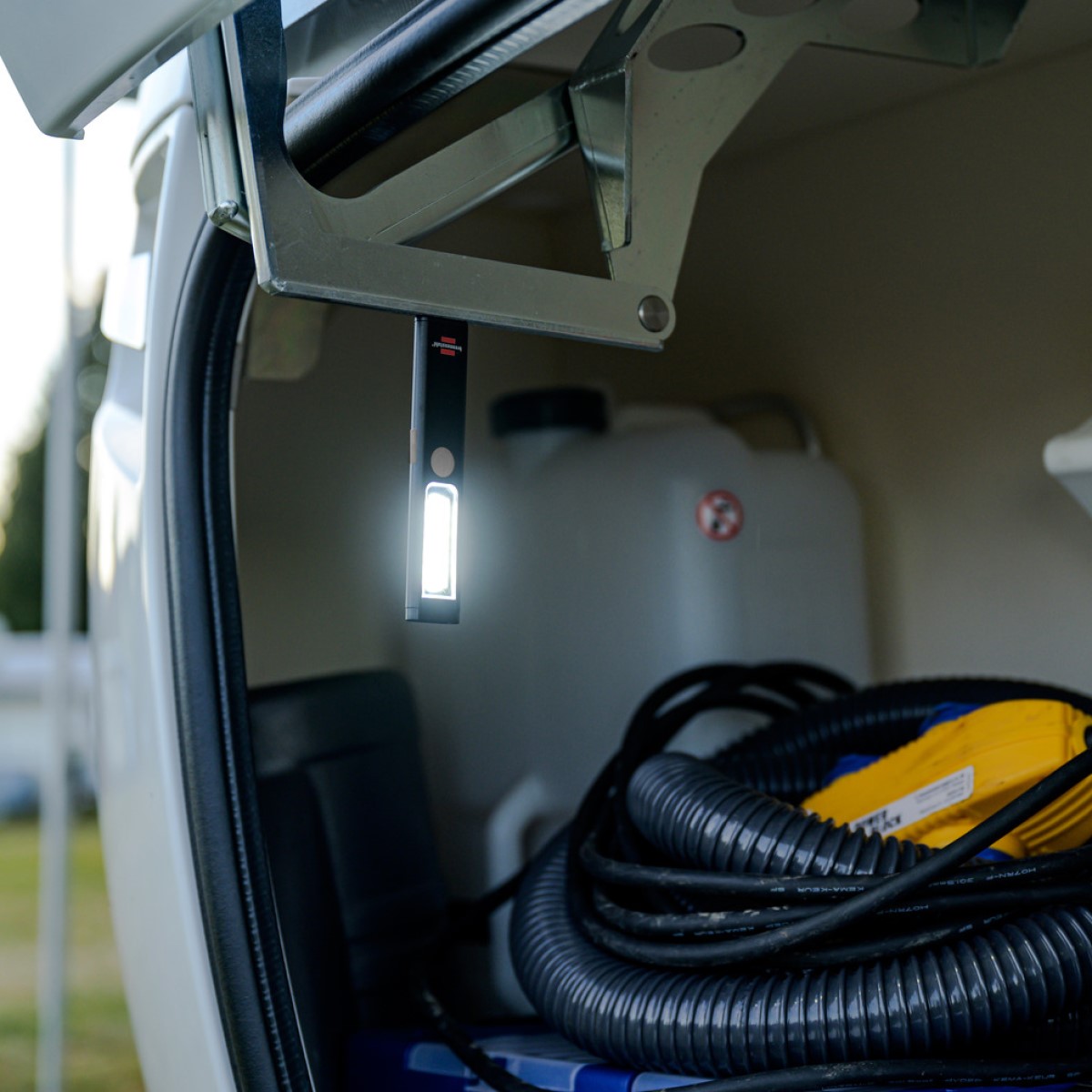 - Uzlādējama darba lampa ar iebūvētu akumulatoru (Li-Pol akumulators 3,7 V / 450 mAh) ir ideāli piemērota šaurāko telpu apgaismošanai, pateicoties tās plānajam un parocīgajam dizainam.