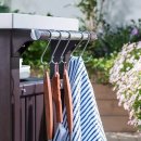 - Ietilpīgs divdurvju skapis, kas aprīkots ar funkcionālu nerūsējošā tērauda virsmu un parocīgu rokturi ar dvieļu āķiem, lieliski darbosies svarīgās ģimenes sanāksmēs uz terases vai dārzā.
