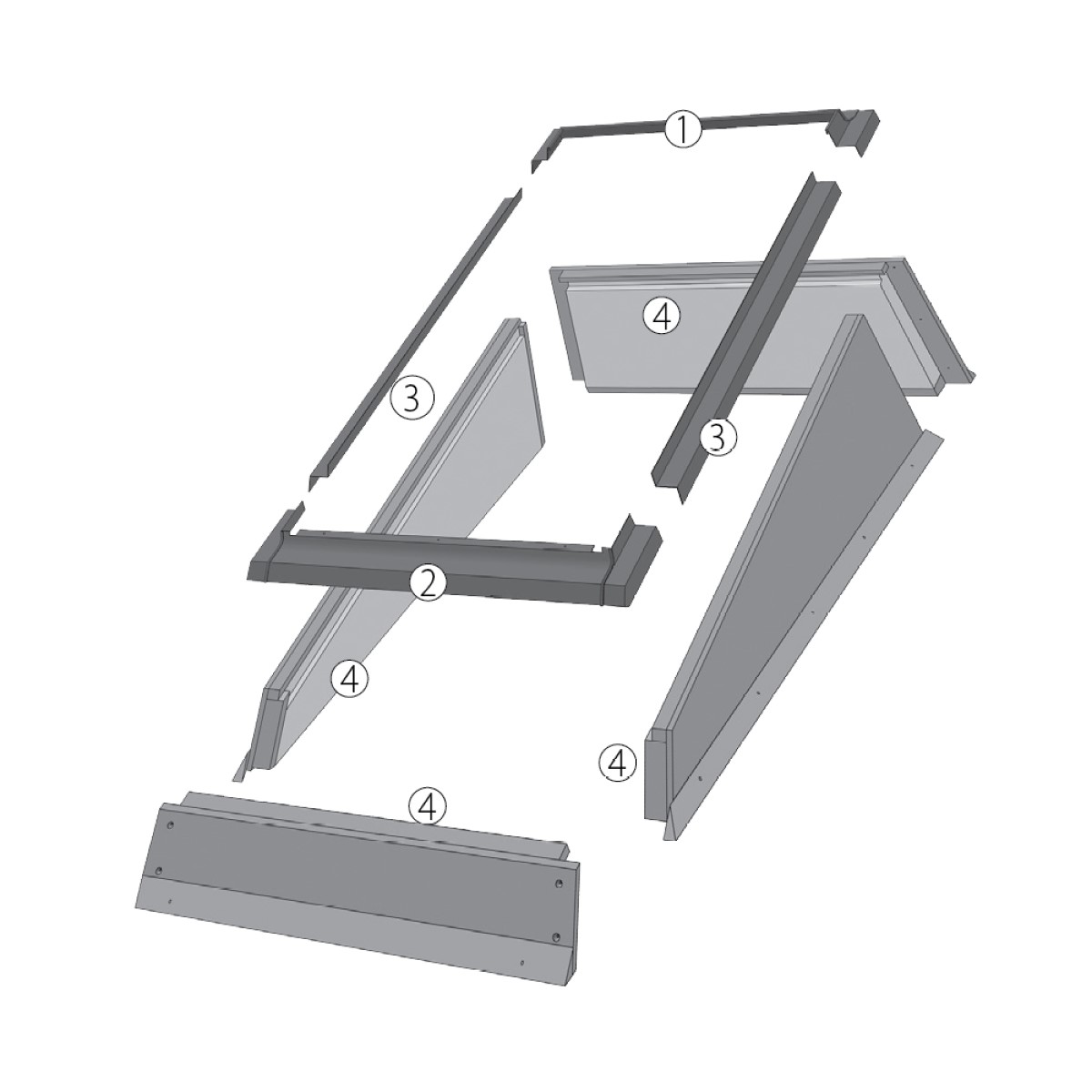 Pieslēguma elementi: Konstrukcija sastāv no divām daļām: koka pamatnes ar papildu siltumizolācijas materiālu un alumīnija pieslēguma, kurš savieno jumta logu ar jumta segumu. Skavas loga montāžai ir iekļautas komplektācijā. Pēc pamatnes montāžas nepieciešams veikt konstrukciju izolēšanu un jumta seguma sadures vietas un to piestiprināt pie jumta seguma.