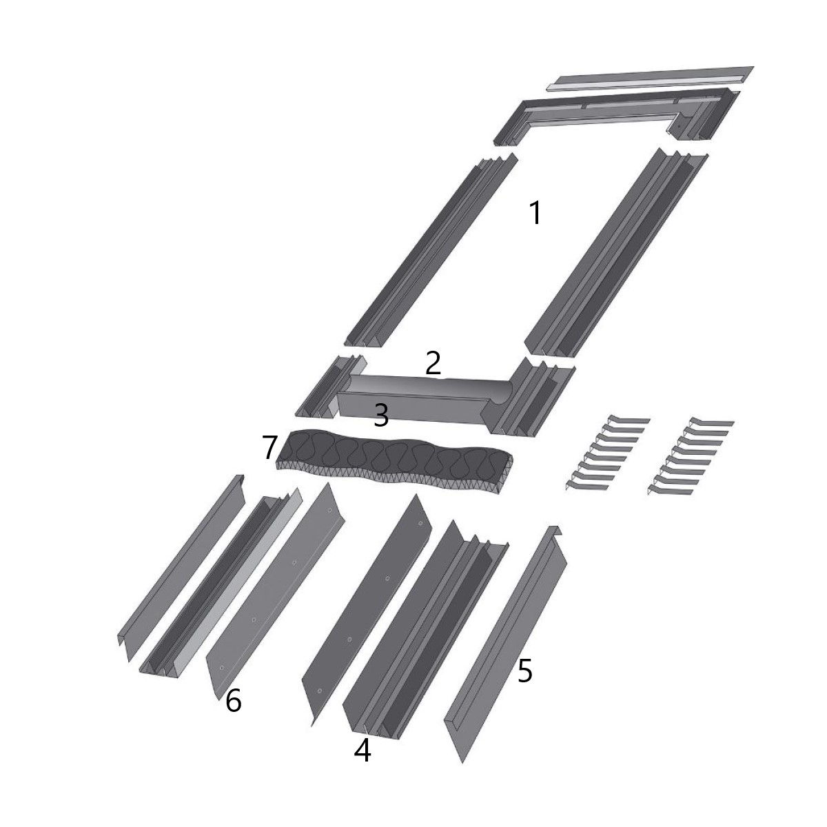 Pieslēguma elementi: EU pieslēgumi fasādes - jumta logiem sastāv no elementiem, kas savieno jumta logu ar jumta segumu, savieno jumta logu ar fasādes logu, elementiem, nosedz fasādes logu un tā savienojumu ar sienu, kā arī nosedz spāres malas 120 cm garumā.