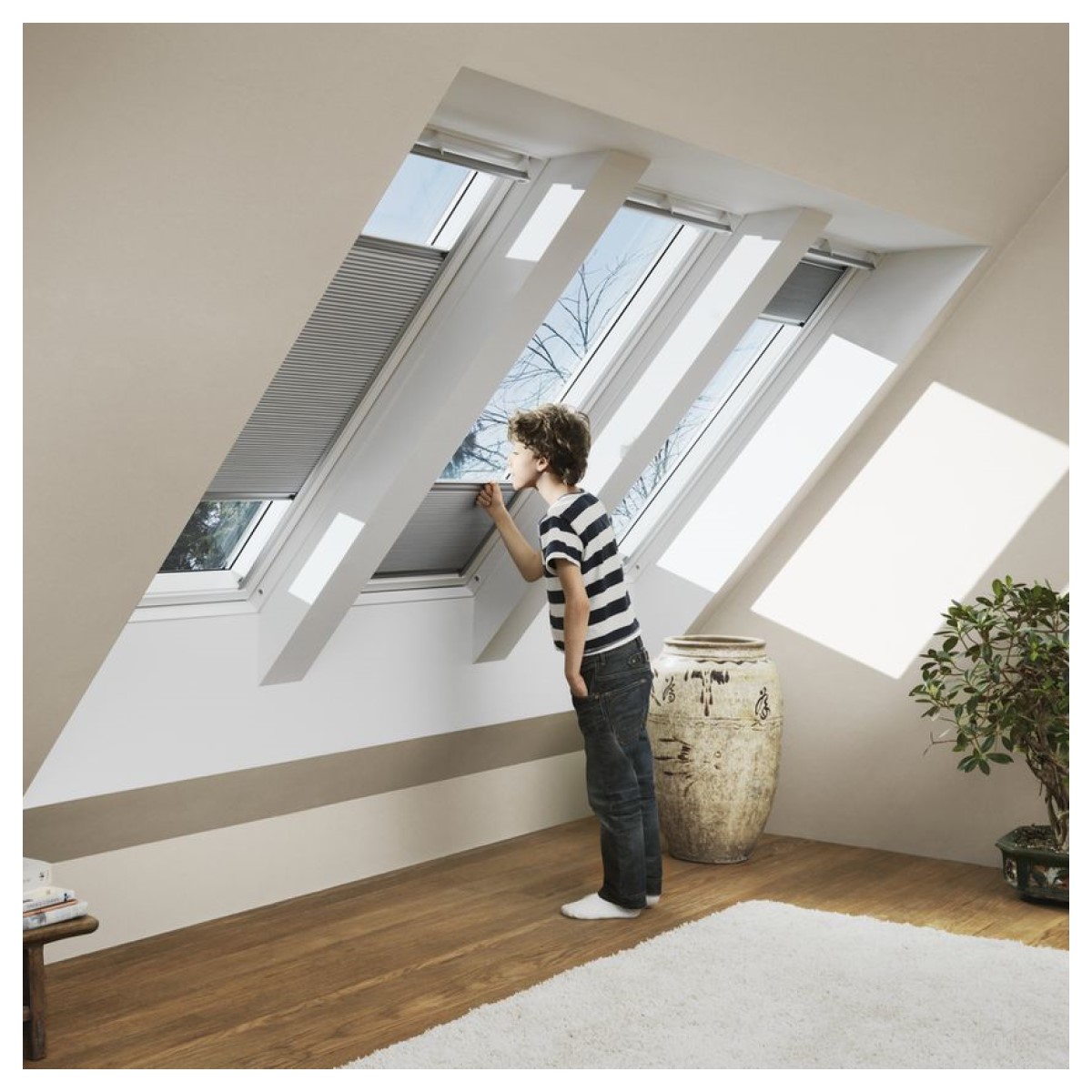 - VELUX manuāli vadāmās žalūzijas nodrošina vienkāršu darbību ar roku. Rokturis un sānu profili nodrošina vienmērīgu žalūziju darbību un elastīgu novietojumu.