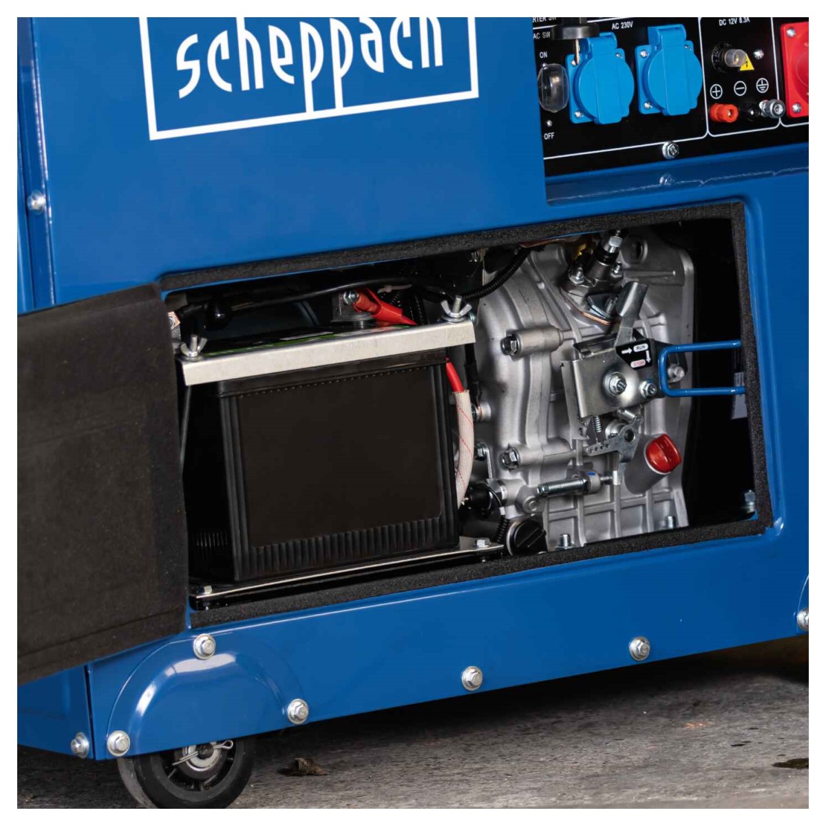 Scheppach SG5200D strāvas ģeneratoru darbina 418 cm³ 4-taktu dzinējs ar maksimālo jaudu 5000 W darbam ap māju un būvlaukumā. Aprīkots ar 400 V~ (7,6 A) ligzdu, divām 230 V~ (13 A) maiņstrāvas ligzdām ar pārslodzes aizsardzības slēdzi un 12 V līdzstrāvas (8,3 A) savienojumu.