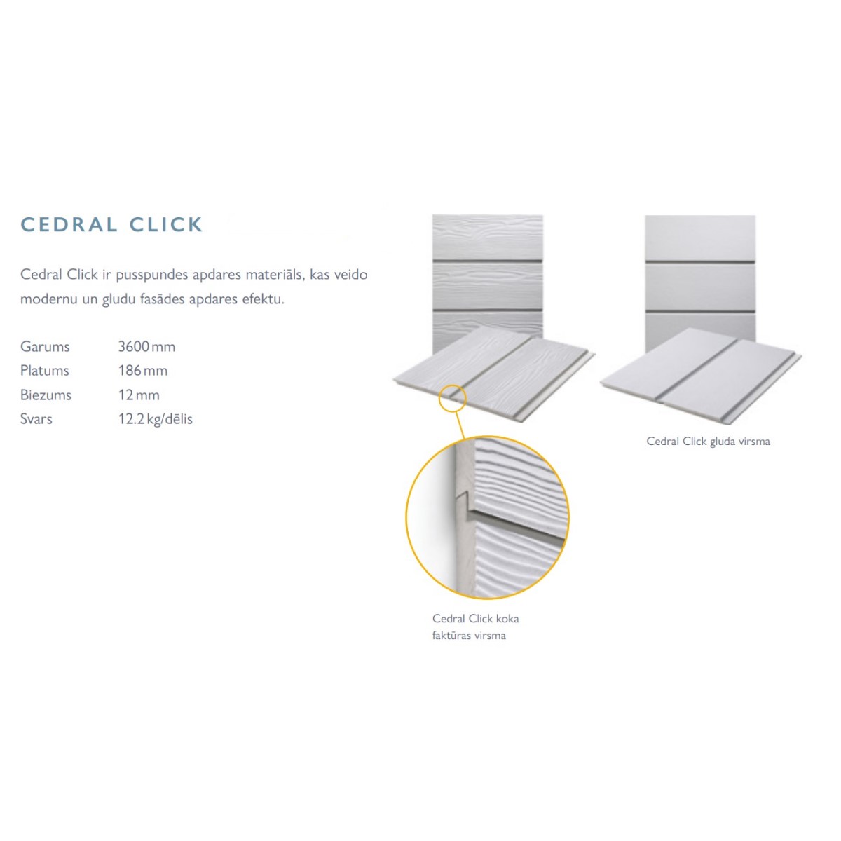 Cedral Click ir viegli montējams fasādes apdares produkts ar mēlītes un rievas mehānismu, piemērots mūsdienīgas vienlaidu apdares izveidošanai. Click Wood - koka tekstūra.