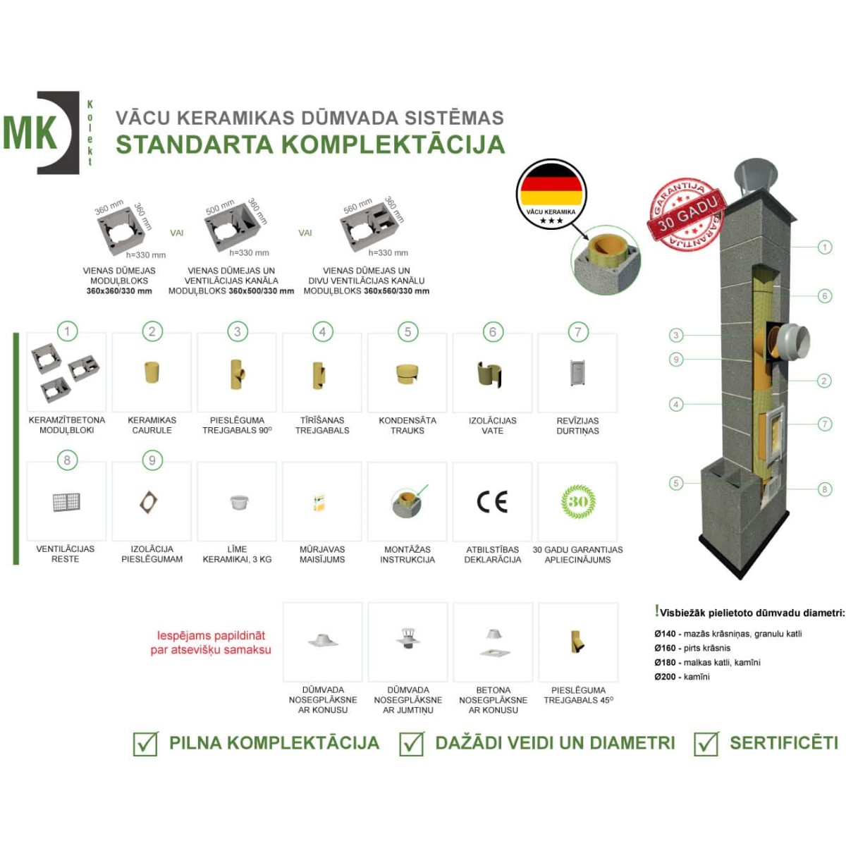 Dumvada sistēmas standarta komplektācijā ietilpst: keramzītbetona moduļbloki, keramikas caurule, pieslēguma trejgabals 90°, tīrīšanas trejgabals, kondensāta trauks, izolācijas vate, revīzijas durtiņas, ventilācijas reste, izolācija pieslēgumam, līme keramikai 3 kg, mūrjavas maisījums 25 kg, montāžas instrukcija, atbilstības deklarācija, 30 gadu garantijas apliecinājums.