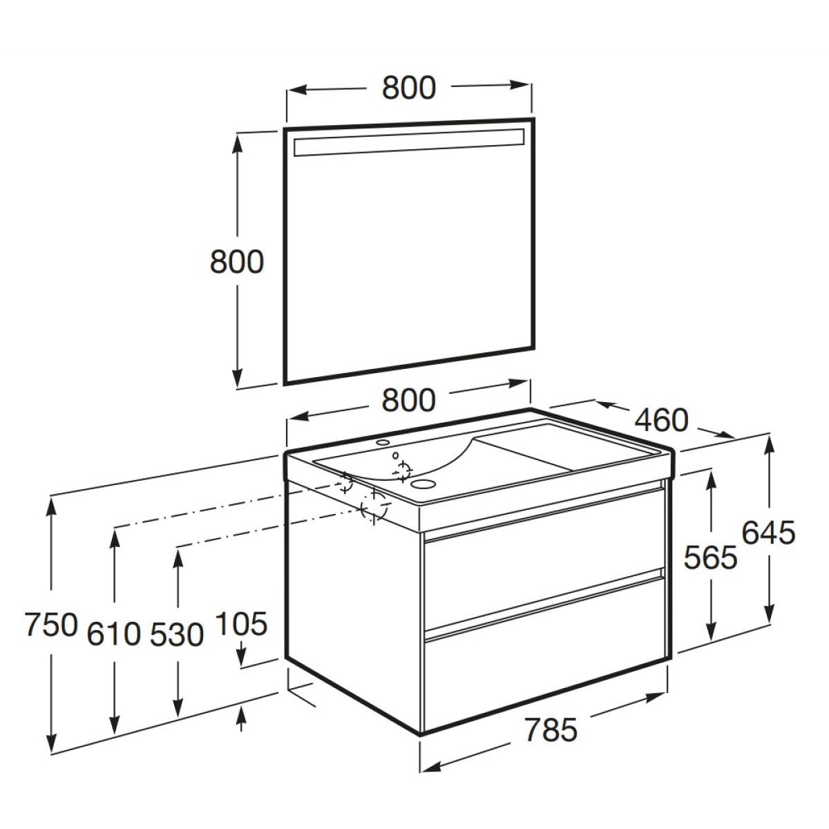 - Keramikas izlietne, novietota kreisajā pusē, arī maisītāja caurums ir kreisajā pusē. Labajā pusē integrēts virsmas plaukts. Maisītājs neietilpst komplektācijā.