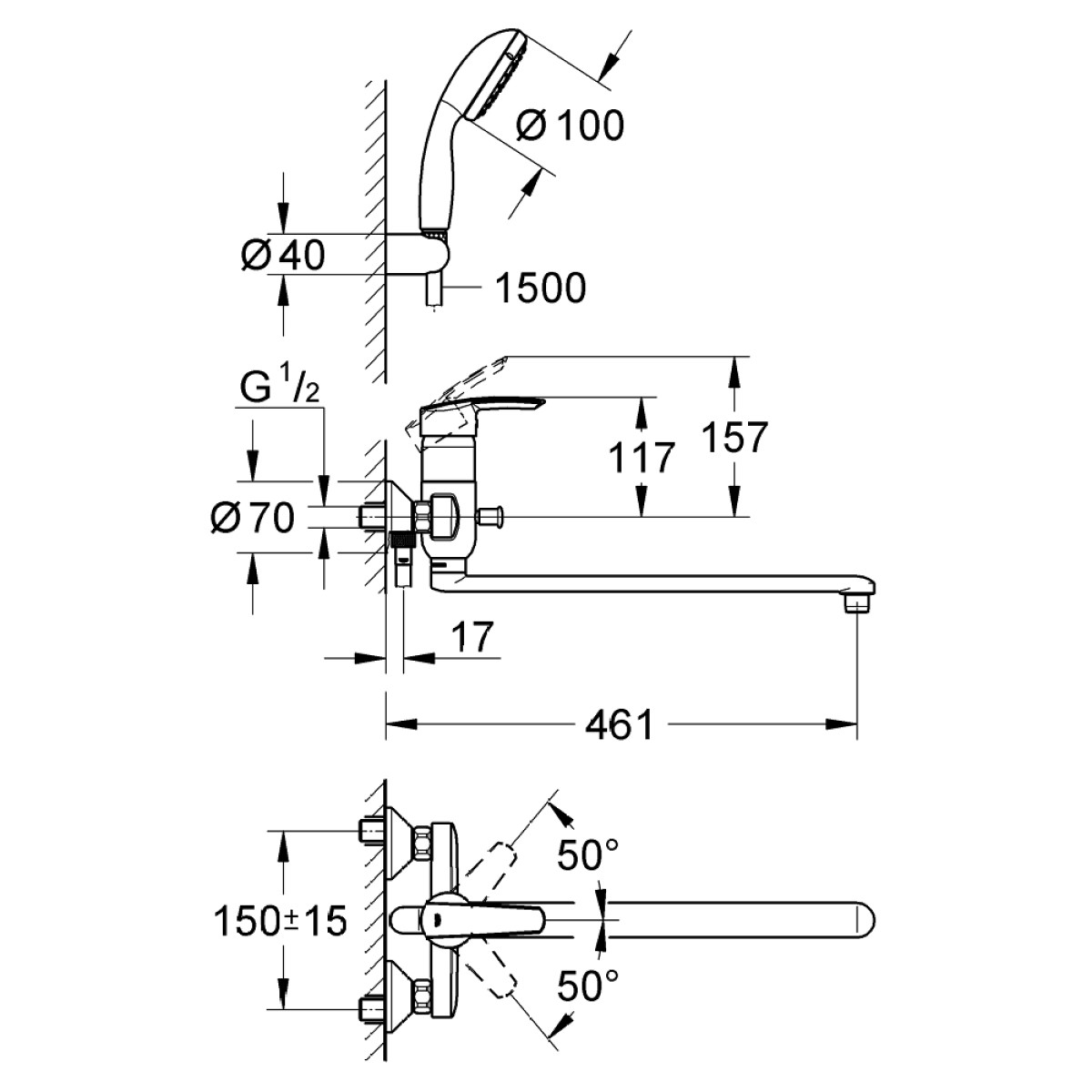 Komplektā: Rokas duša Tempesta 100 II (9,5 l/min), sienas dušas turētājs, dušas šļūtene Relexaflex 150cm (1/2" x 1/2").