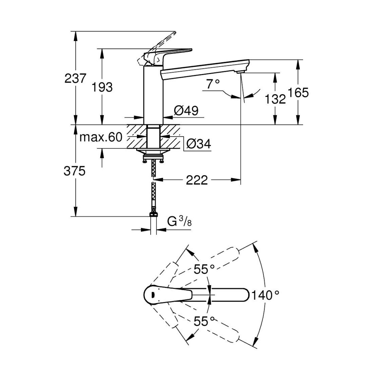 - Grozāms cauruļveida snīpis, pagriešanas laukums 140°.