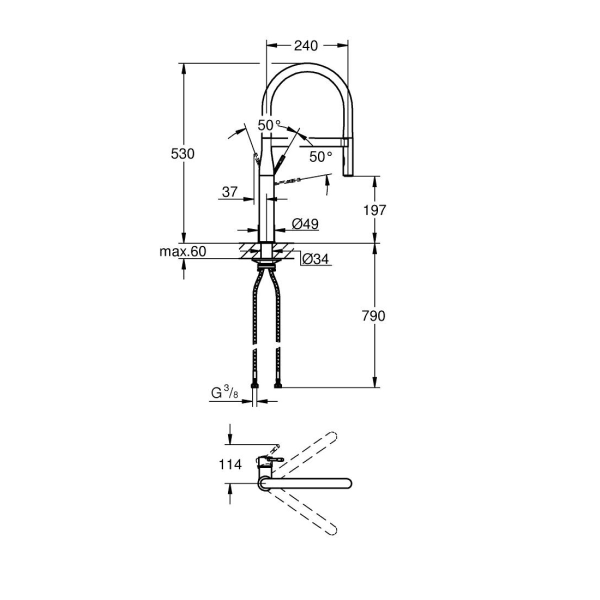- Ar elastīgu, higiēnisku GROHFlexx virtuves Santoprene šļūteni.