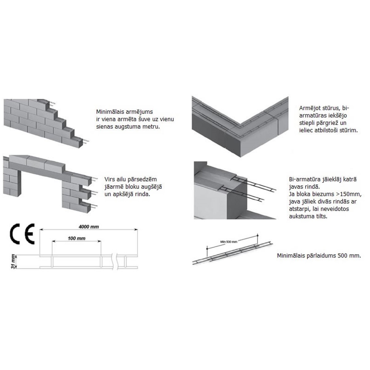- Vidējais patēriņš: 11,5m/m3 bloku (liekot 2 rindās = 23m/m3).