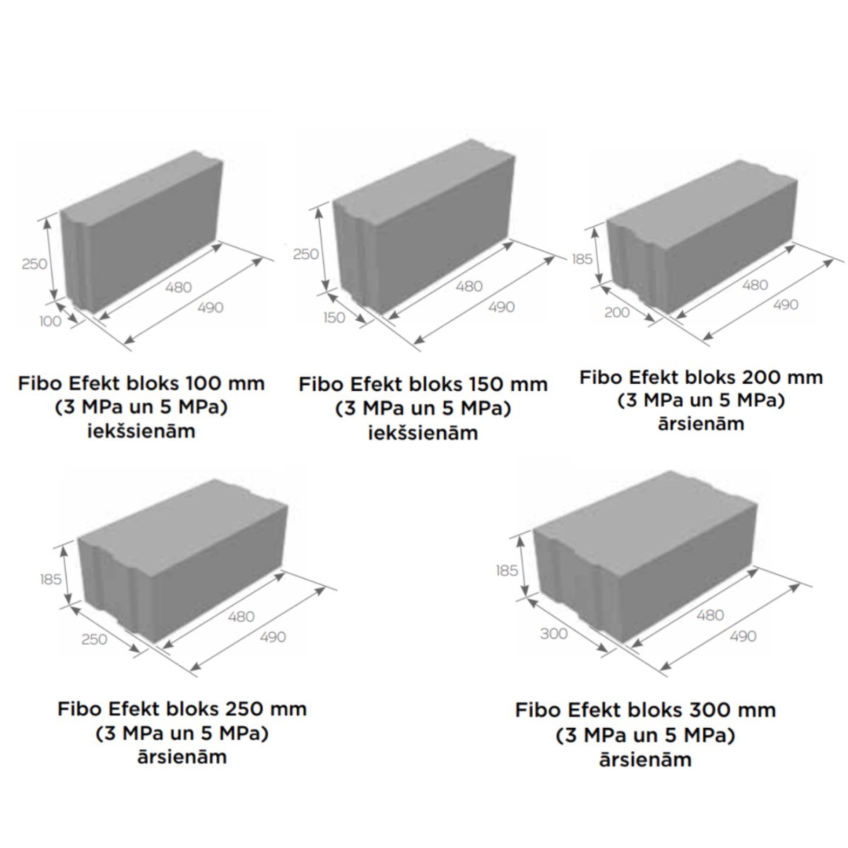FIBO® Efekt bloki ar gropes savienojumu Iekšsienu izbūvei paredzētie 100mm un 150mm platie Fibo Efekt bloki ar spiedes izturību 3MPa vai 5MPa, kuru augstums ir par 65mm augstāki nekā līdzšinējie standarta bloki. Spiedes izturības, siltumvadītspējas un citu īpašību ziņā Fibo Efekt ir analogi līdzšinējiem Fibo blokiem.