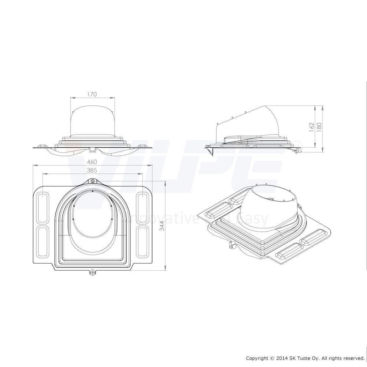 Universāls pieslēgums profilēta metāla lokšņu jumtiem ar viļņa augstumu līdz 38 mm. Ūdensdrošs pateicoties konusveida gumijas blīvslēgam ar pielāgojamu alumīnija flanci.