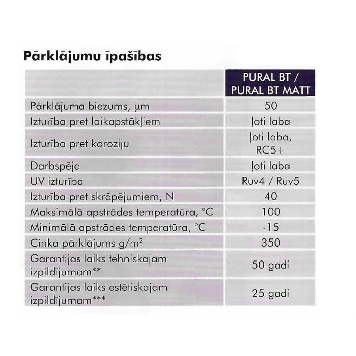 - Pārklājuma veids: PURAL BT MATT- materiālu ar šo pārklājumu izmanto ārējo un iekšējo virsmu klāšanai un apstrādei. Šis materiāls ir īpaši noturīgs pret koroziju, ultravioleto starojumu un ķīmisko iedarbību, turklāt ir apstrādājams zemā temperatūrā, pārklājums ir matēts.