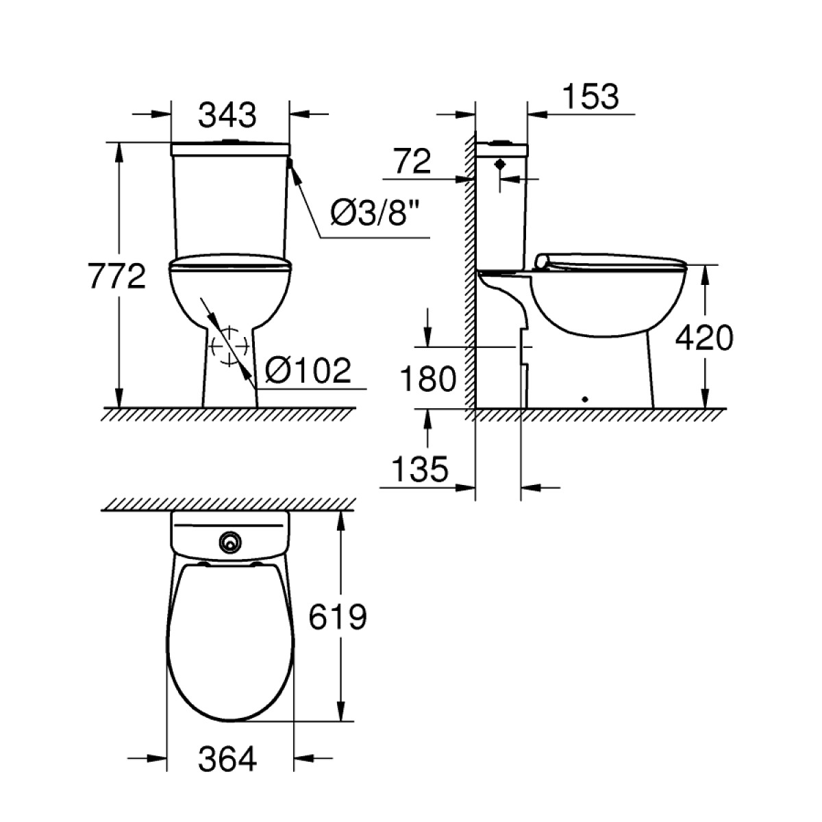 Grohe Bau Ceramic Rimless Pods ar soft close (QR) vāku, horizontāls izvads.