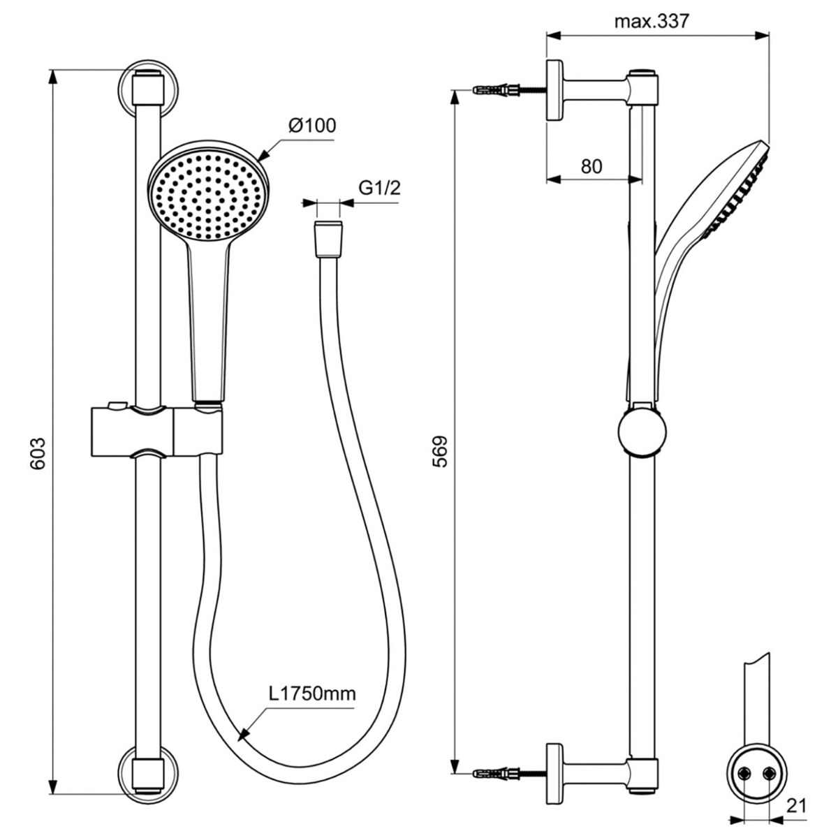 - Dušas stienis 600 mm, 21 mm diametrs, bīdāms rokas dušas turētājs ar 1 režīmu.
